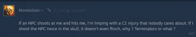 - Il comportamento e le reazioni dei PNG saranno migliorati in uno dei prossimi aggiornamenti che arriveranno nel gioco entro la fine dell'anno. Barcollano già quando vengono colpiti, ma non è una bella esperienza se vengono colpiti in testa e la gestiscono come dei campioni. Ci daremo un'occhiata.
