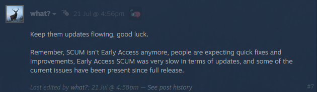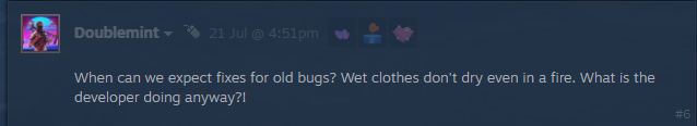 - Questo sta facendo molti giri e possiamo vedere che molti giocatori ne sono interessati, quindi lasciatemi rispondere dicendo che il team è a conoscenza del problema e che è già stato fatto del lavoro per mitigarlo. Tutto sommato, vorrei solo dire che il team vi ha ascoltato e che ci stiamo occupando della questione. Nel frattempo, assicuratevi di usare un falò, di togliervi i vestiti bagnati e di tenerli il più vicino possibile al fuoco. So che alcuni diranno che anche questo non funziona – funziona, anche se lentamente.