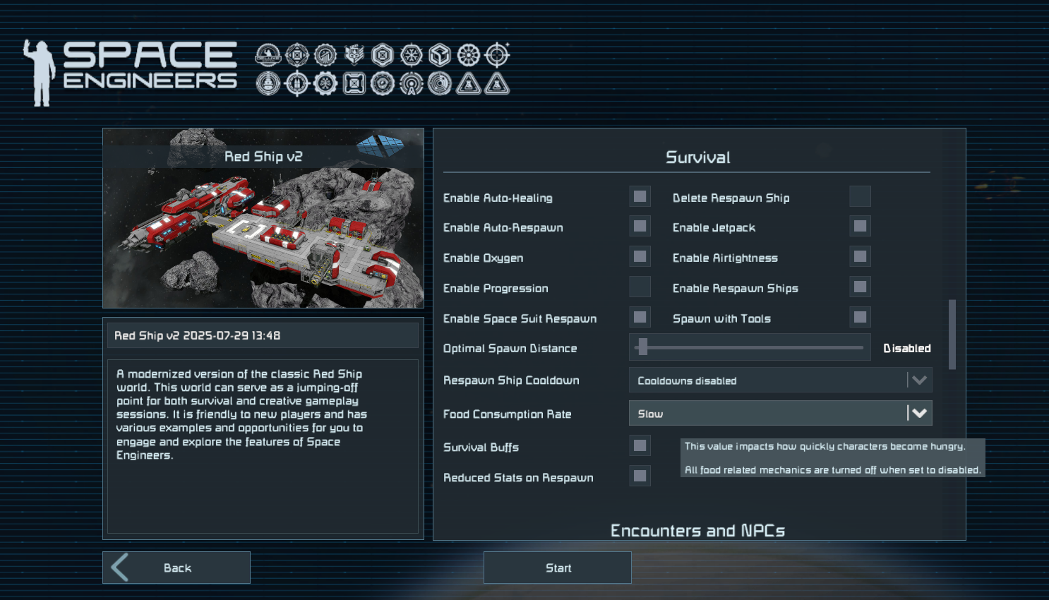 Per aumentare la posta in gioco, la nuova opzione Statistiche ridotte nel mondo di respawn ti fa partire con solo il 20% di tutti i parametri vitali (salute, cibo, energia, ossigeno e idrogeno) quando riappari al di fuori di una nave iniziale. Non si tratta più di un semplice reset rapido: la morte è diventata qualcosa da evitare.