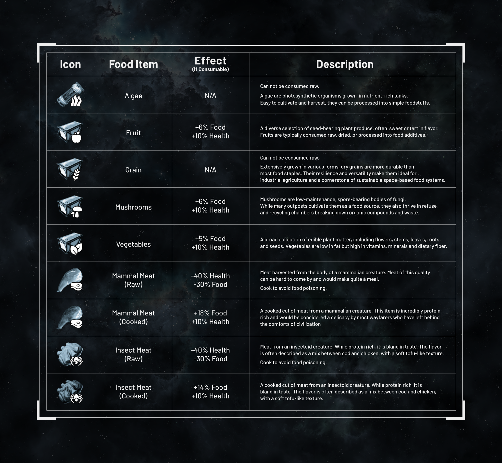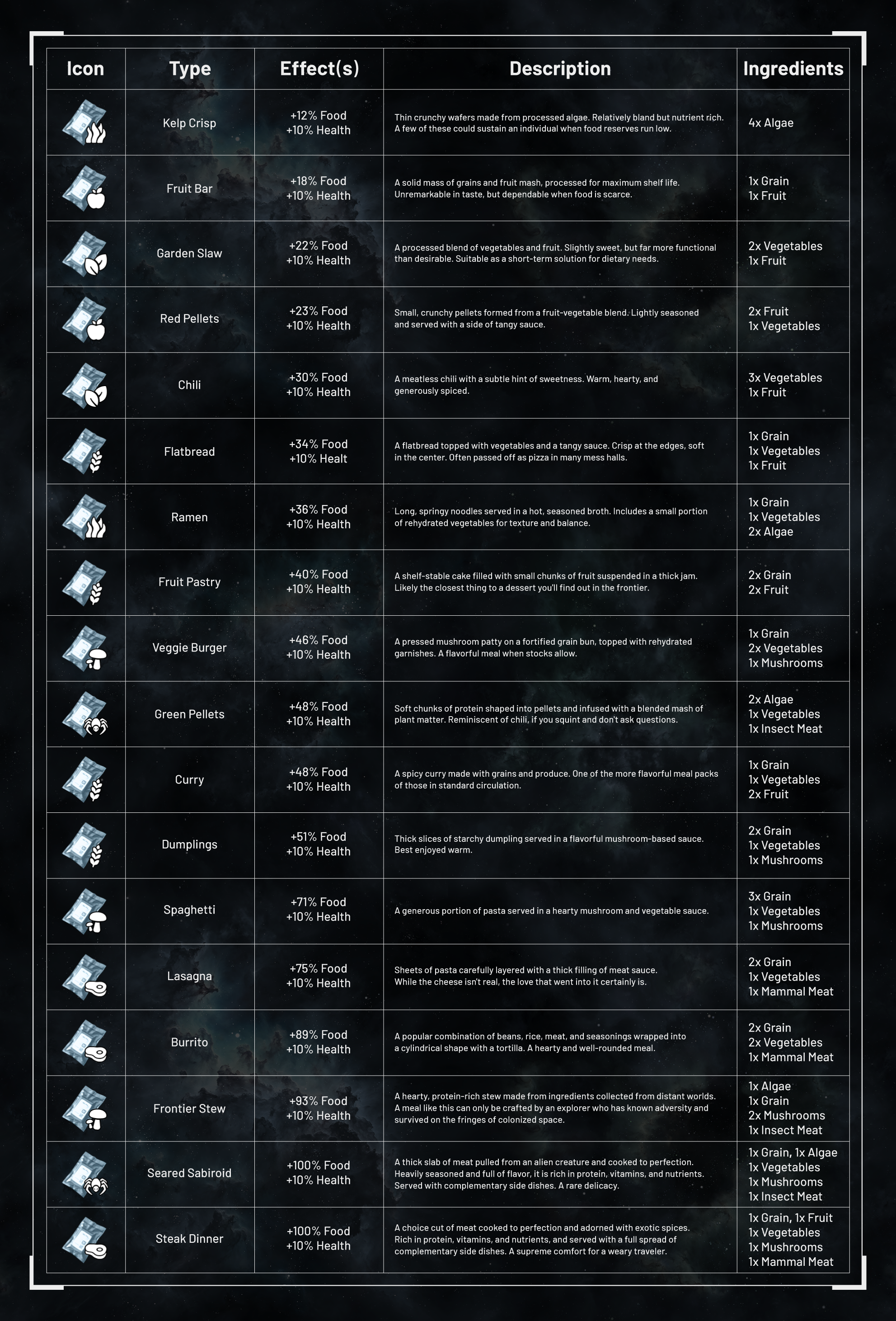 Abbiamo anche aggiunto rari consumabili, che possono essere ottenuti solo tramite bottino, che non possono essere creati nel Robot da Cucina e si trovano solo esplorando, incontrando o saccheggiando i PNG. Ma attenzione: non tutto ciò che si recupera è sicuro. Alcune di queste "prelibatezze" potrebbero avere effetti collaterali inaspettati (o spiacevoli).