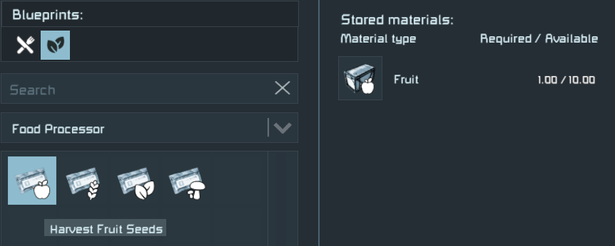 Per iniziare a coltivare, avrai bisogno di semi, ed è qui che entra in gioco il Robot da Cucina . Nel suo menu di produzione, troverai la categoria "Raccolta" che ti permette di convertire frutta, cereali, funghi e verdure in pacchetti di semi o spore. Questi possono poi essere posizionati nei lotti agricoli per iniziare a coltivare le tue fonti alimentari rinnovabili.