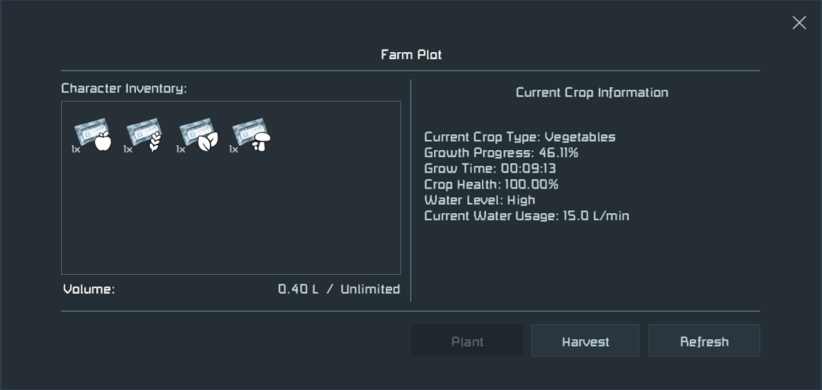 Gli appezzamenti di terreno coltivano frutta, cereali, funghi e ortaggi , ognuno con velocità di crescita, consumo di acqua e rese uniche. Le colture hanno un valore per la salute e sono sensibili ai fattori ambientali:
