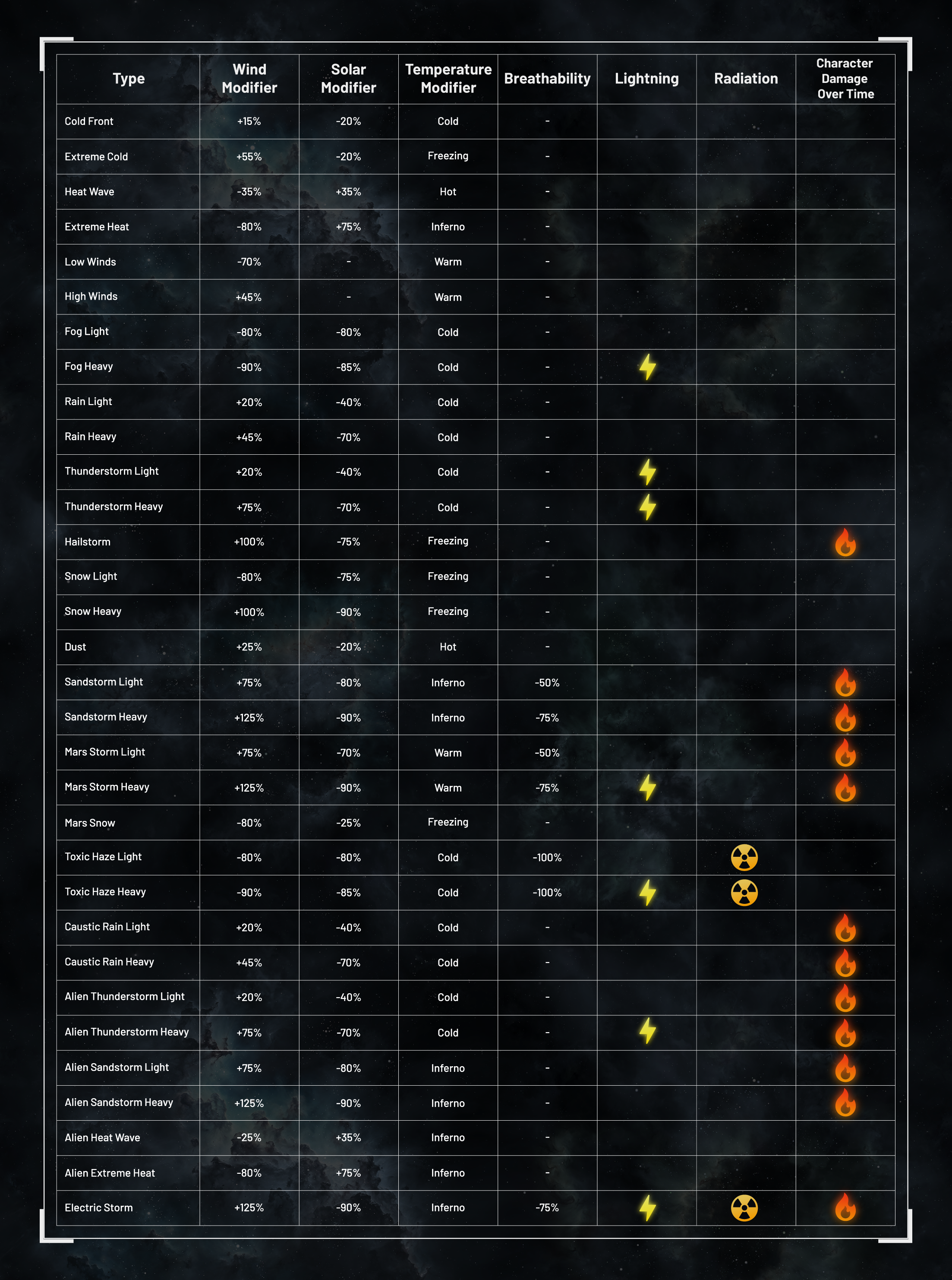 Tutti gli effetti meteorologici sono stati aggiornati con nuovi valori e una grafica migliorata. Alcuni tipi di condizioni meteorologiche estreme sono ora direttamente pericolosi per i personaggi, infliggendo danni nel tempo quando esposti. Le griglie non sono interessate e i rifugi proteggeranno completamente i personaggi da questi effetti.
